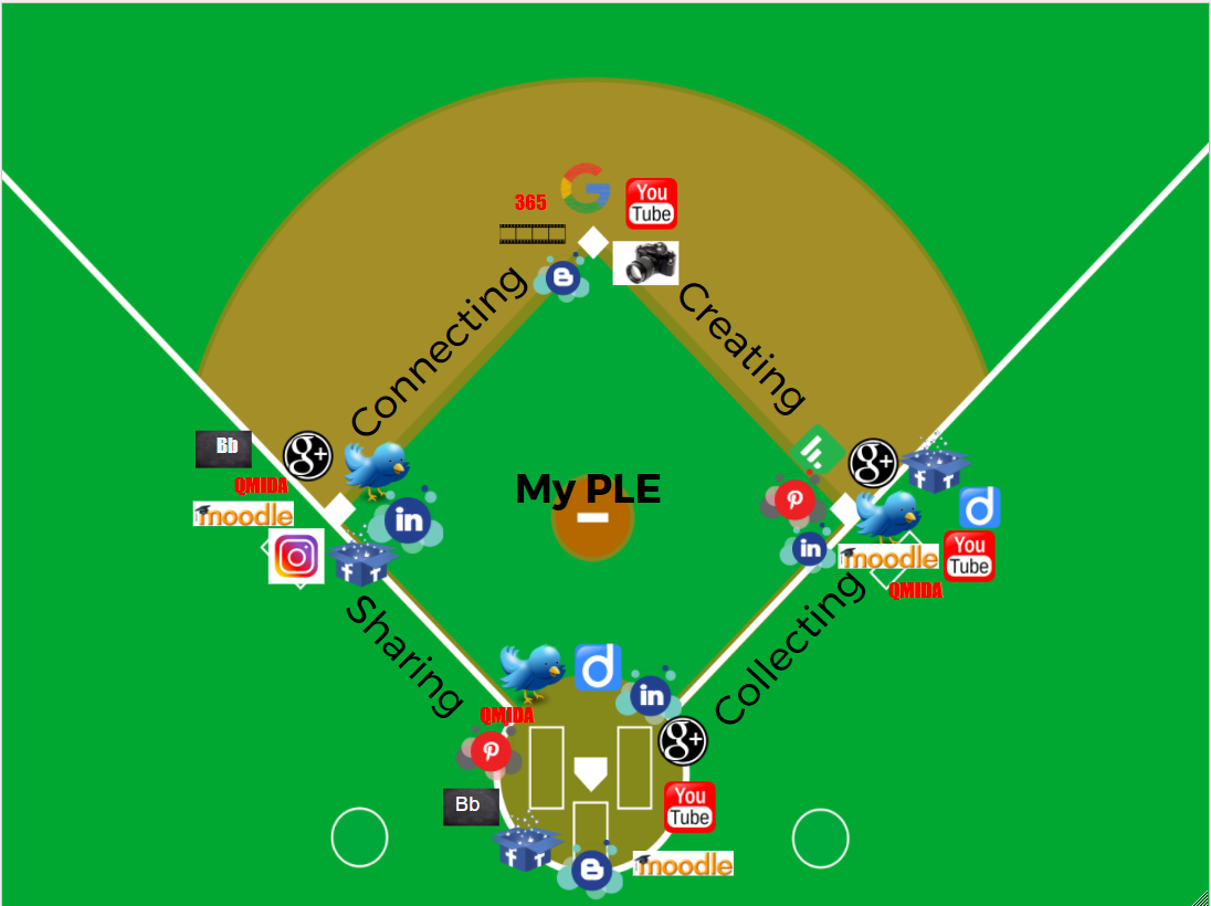After reading about the different models, I was torn between the 4 C’s model and the model with gathering, processing, and acting on learning. Really, they are very similar. I decided to use the four C’s, but I changed the wording a bit and went with the categories of collecting, creating, connecting, and sharing, and then I finally decided on a baseball theme as a metaphor for learning is fun, The design shows connections between the communities at the bases, as well as, along the base paths, and it illustrates the cyclical process of learning as you round the bases.